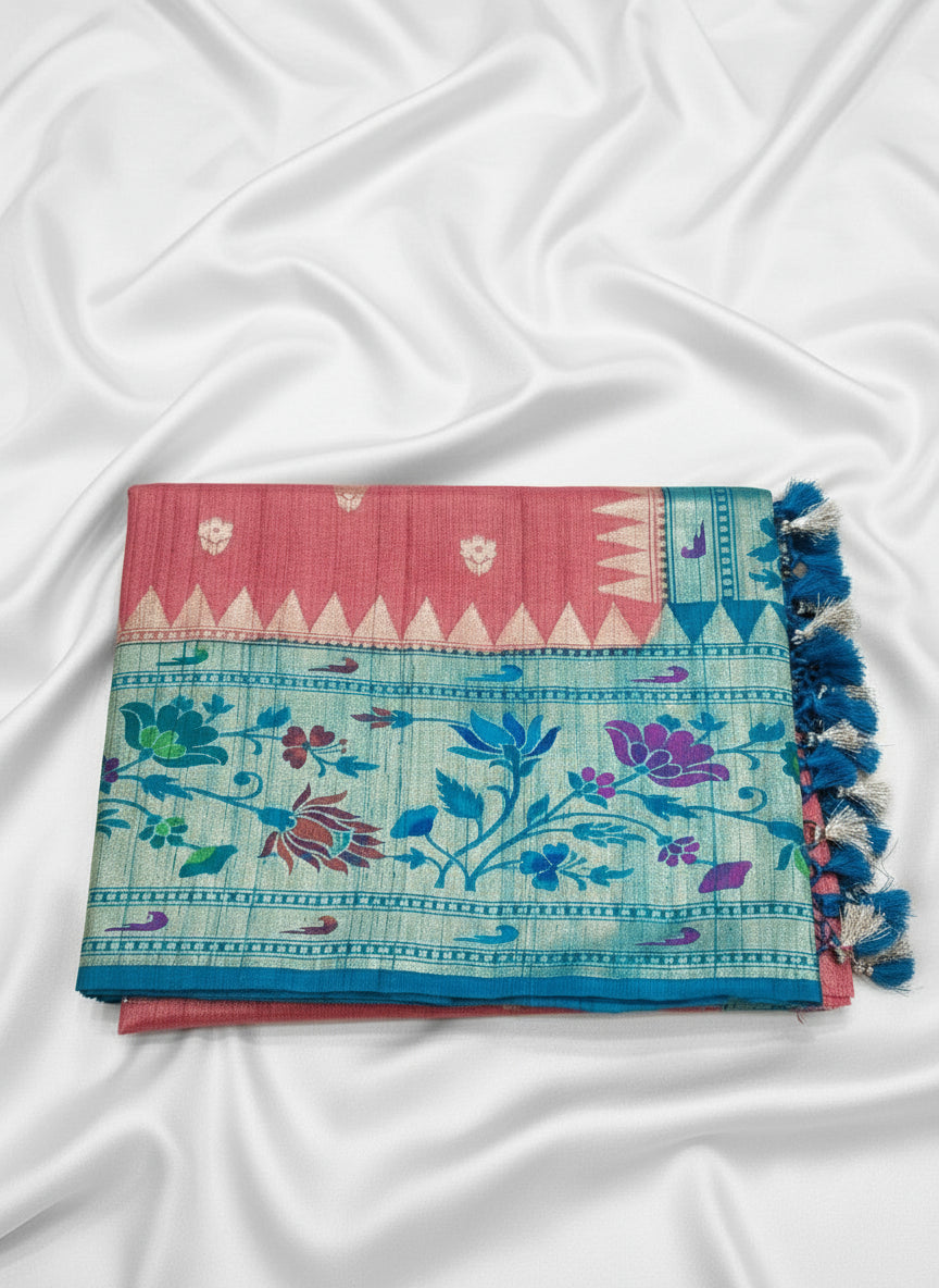 Pure tussar coral pink saree adorned with a striking peacock blue Paithani border — a perfect blend of tradition and elegance. Its unique design and soft, natural sheen make it a versatile choice that complements every occasion and style. Graceful, timeless, and effortlessly classy, this saree beautifully balances subtle charm with rich detailing.
