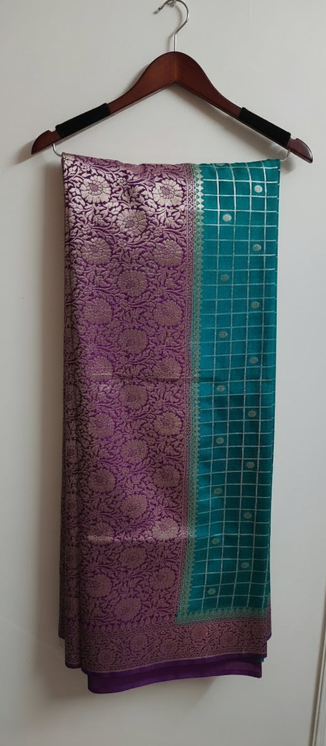 Elevate your ethnic wardrobe with this stunning semi Banarasi silk saree that seamlessly blends tradition with contemporary elegance. Featuring intricate checks and buttas throughout with a rich purple border and pallu . The generous gold zari highlighting adds a regal touch, making it perfect for festive occasions, celebrations, or when you want to make a lasting impression. The semi Banarasi fabric ensures comfortable draping and effortless wear, while the sophisticated color palette and detailed embellishments deliver that coveted rich, polished look. A versatile investment piece that transitions gracefully from day events to evening gatherings.