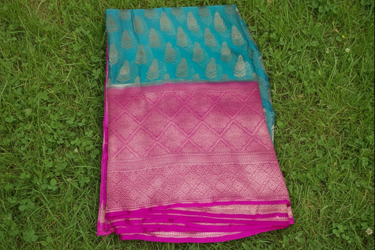 Light Blue Pink Pure Khaddi Chiffon Saree